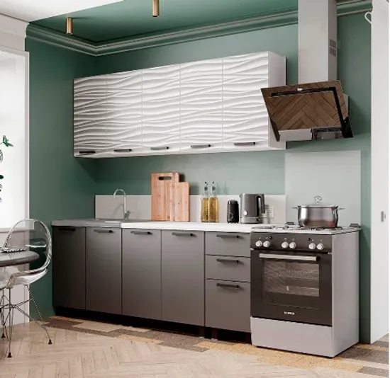 Тренд сезона — фотопечать с волнистыми линиями, которым декорированы верхние фасады кухни. Больше никакой правильной и пропорциональной геометрии, сегодня в моде изгибы, которые придают интерьеру новый стиль. Сочетание холодного серого с теплым коричневым цветом нижних фасадов выглядит по-домашнему уютно и гармонично.