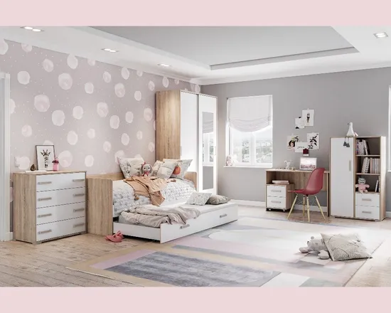 комод, кровать односпальная, стеллаж, стол письменный, тумба выкатная, шкаф-купе