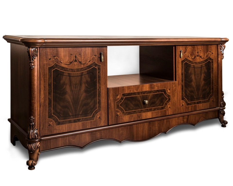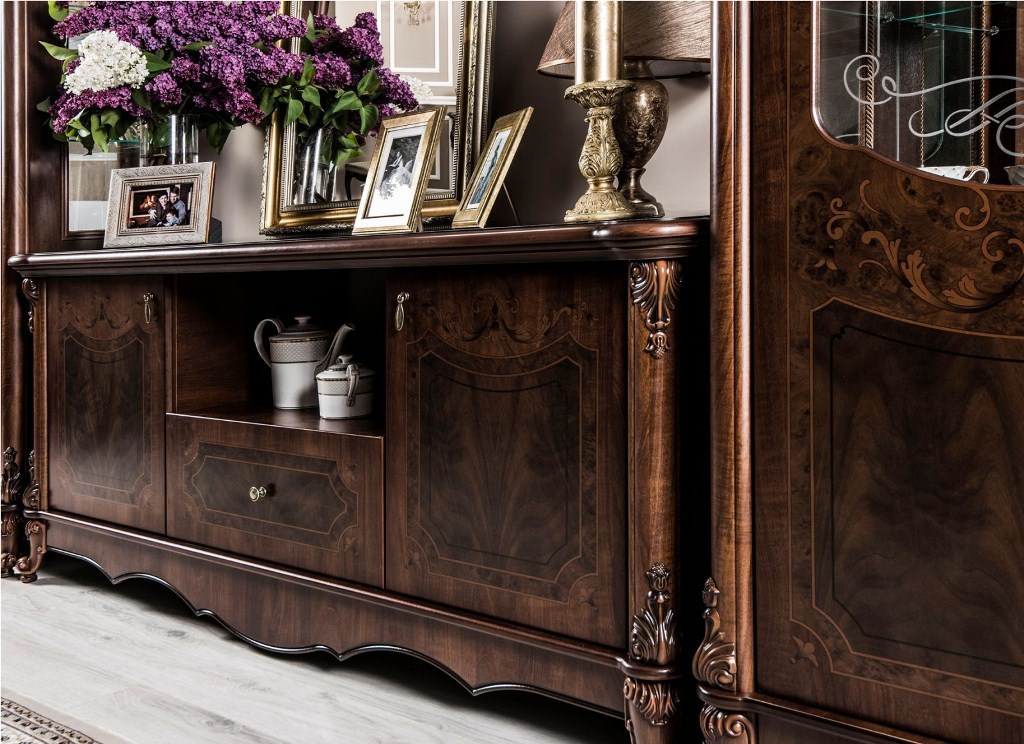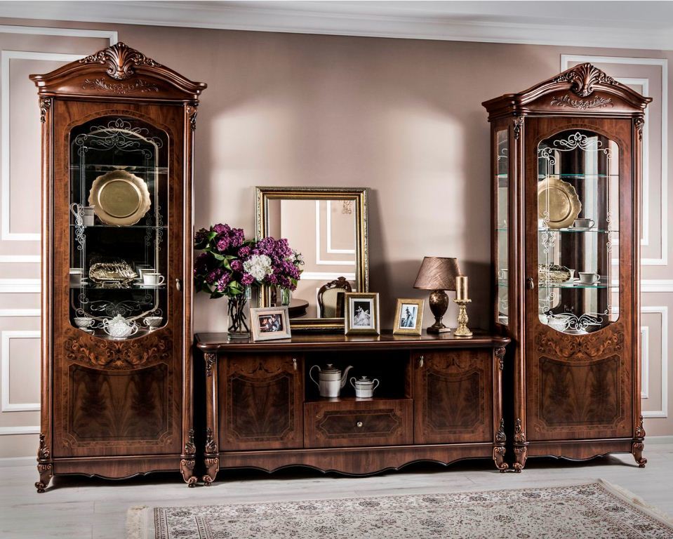 - Роскошная стенка, состоящая из двух витрин (левой и правой) и тумбы ТВ - жемчужина классического интерьера.