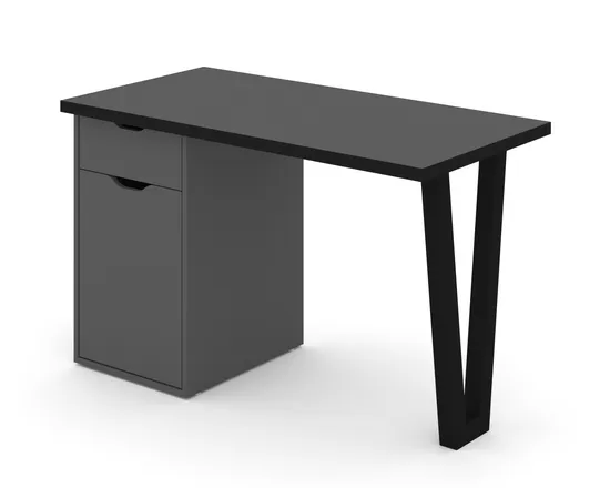 V-образная металлическая опора, лицевая фурнитура отсутствует, ящик и дверца открываются за край фасада, направляющие ящика бесшумного закрывания, направляющие ящика полновыкатного типа, петли вкладные, торцевые стороны столешницы обработаны кромкой ПВХ 2 мм, остальные детали - кромка ПВХ 0,4 мм