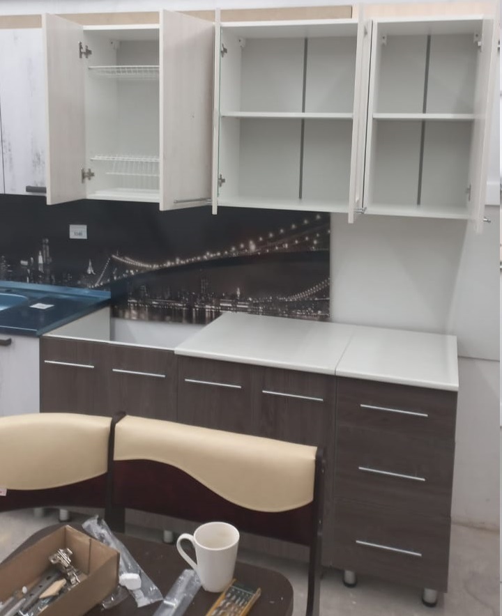 большое количество полок способно вместить много предметов, посудосушитель в комплект НЕ входит, свободное размещение модулей, столы комплектуются цоколем ЛДСП в цвете корпуса