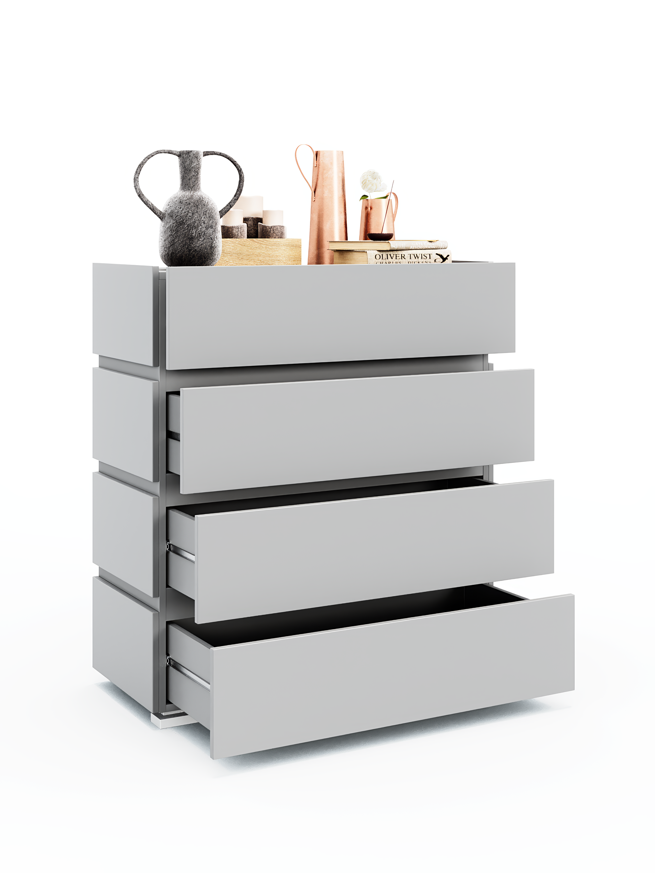 кромка ПВХ 0,4 мм, лицевая фурнитура отсутствует, ящики открываются за край фасада, направляющие ящика бесшумного закрывания, направляющие ящика полновыкатного типа