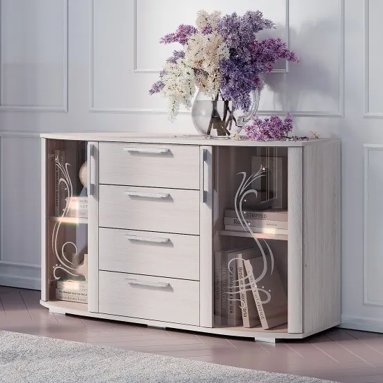 Светлый цвет корпуса и фасада в комбинации с прозрачными стеклостворками делают модель лёгкой, визуально увеличивая пространство комнаты.