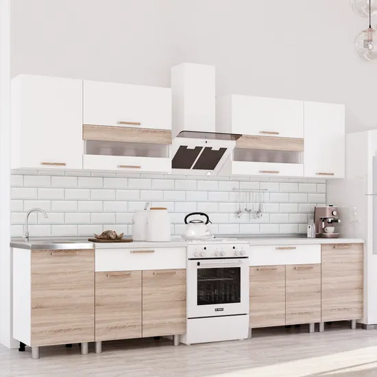 Стильная современная кухня «Айсбери» 2,4 м пропитана атмосферой душевного тепла и солнечного света. Классическое сочетание белого цвета с древесной фактурой - лучшее решение для Вашей кухни!