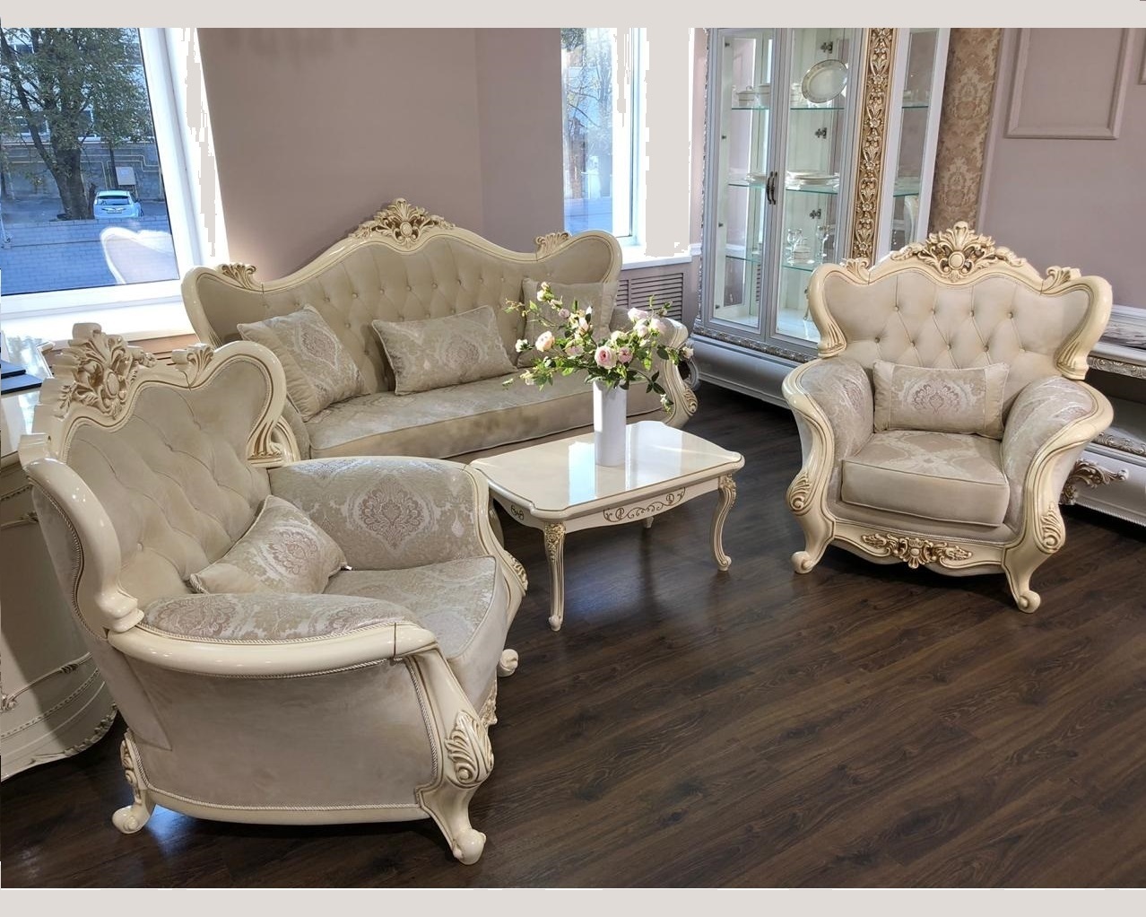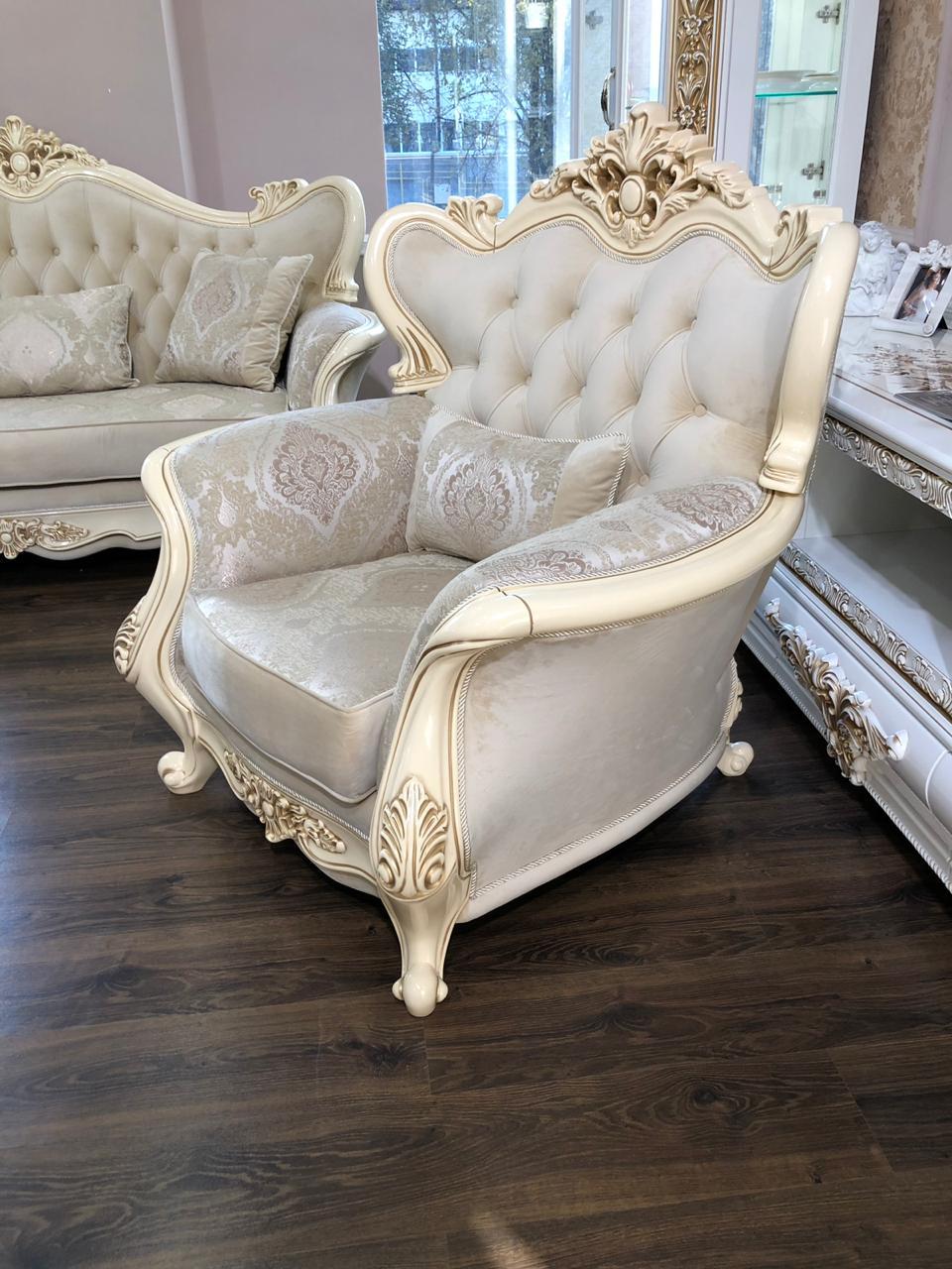 Мягкая мебель ДЖОКОНДА - яркий пример роскошной классической мебели. Нежное кремовое исполнение всех элементов сделает комнату яркой и будет прекрасно смотреться в разных вариациях оформления интерьера. Особенно благородно мебель выглядит благодаря мягким и плавным линиям. Цветовая палитра ткани мягкой обивки варьируется в зависимости от партии ткани. Подушки в комплекте. Ширина дверного проема для помещения, где будет производиться установка мягкой мебели, должна быть не менее 80 см (в просвете).