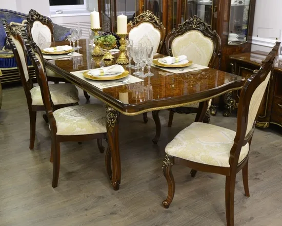 Роскошная столовая ДЖОКОНДА представлена в декоративном стиле Барокко. Она отлично подходит для больших гостиных комнат в насыщенных глубоких тонах, лепниной на потолке и большими хрустальными люстрами. Вся мебель изготовлена из качественного ламинированного ДСП и экологически безопасна для окружающих.
