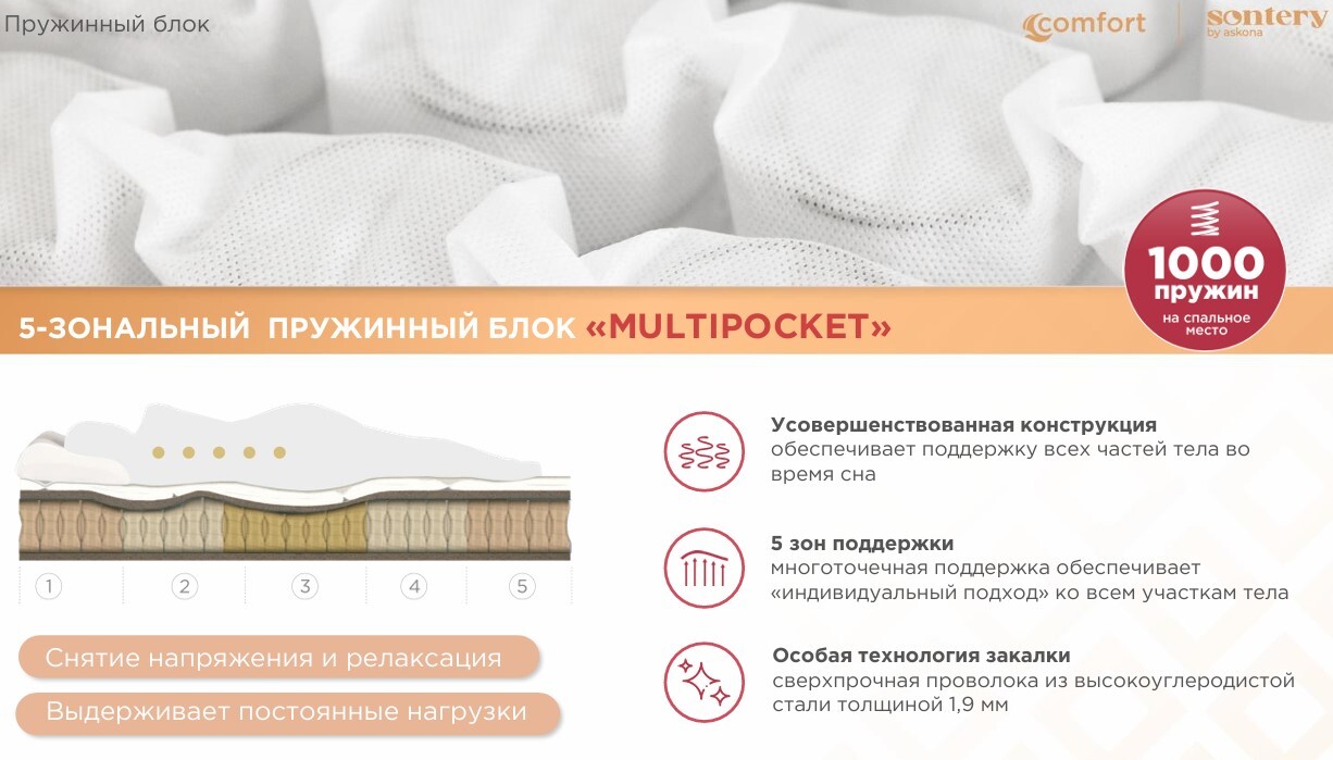 Основные преимущества коллекции: Мягкий эксклюзивный трикотажный чехол с объемной стяжкой. Подарит ощущение необыкновенной мягкости и придаст дополнительный комфорт спальному месту. Непревзойденный комфорт. Сочетание современных наполнителей и превосходной системы поддержки 5-зональный пружинный блок Multipocket. Имеет оптимальное количество зон поддержки и равномерно распределяет нагрузку по всему