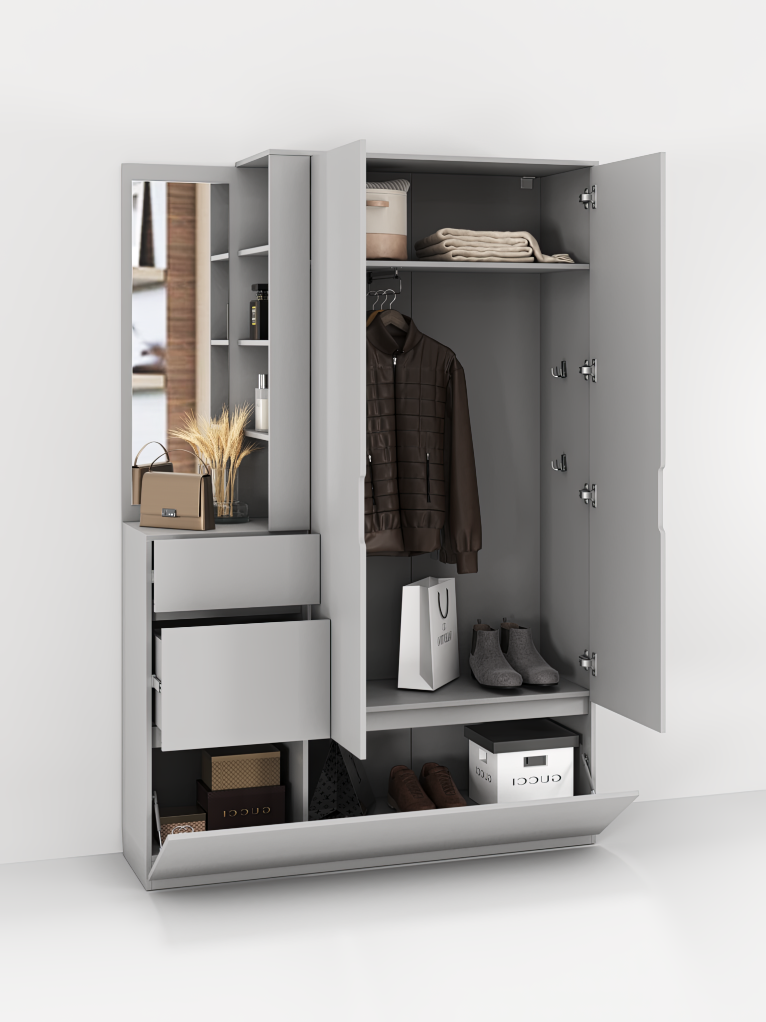 L-образные навесы 2 шт в комплекте, газлифты плавного хода на откидной дверце (2 шт), крючок двухрожковый имеет цвет хром ИЛИ хром матовый в зависимости от партии, направляющие ящика бесшумного закрывания, направляющие ящика полновыкатного типа, торцевые стороны деталей фасадов обработаны кромкой ПВХ толщиной 2 мм!