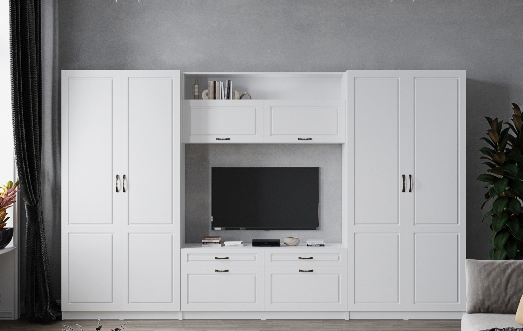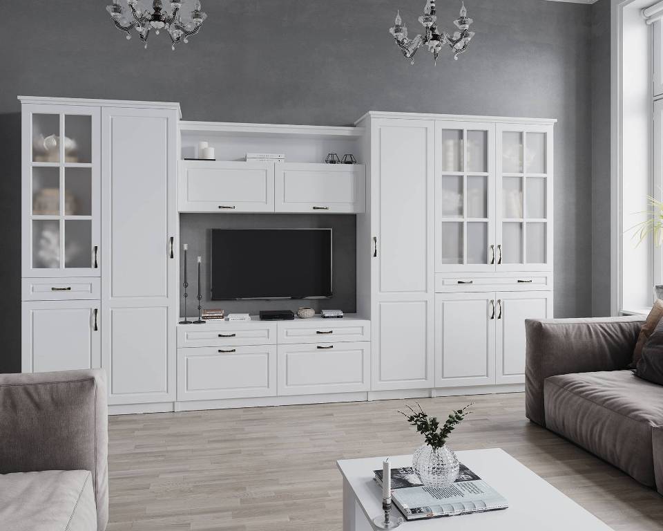 — Шкафы и пеналы гостиной можно дополнить карнизами, которые приобретаются отдельно