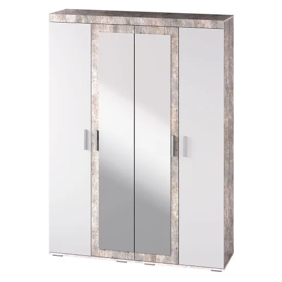 Современный четырёхстворчатый шкаф Инстайл выполнен в стиле одноименной модульной коллекции мебели. Модель состоит из четырех дверок, две из которых – зеркальные. Изделие выполнено в комбинации белого и цвета бетон. Внутреннее наполнение состоит из двух отделений со штангами, а также верхних и нижних полок для вещей. Стильный геометрические ручки украшают шкаф Инстайл.