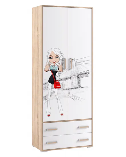— Корпус выполнен из ЛДСП цвета «Дуб Сонома», внутренние фасады двух видов: Белый с тиснением «Древесные поры» или Белый с тиснением «Древесные поры» + фотопечать. Кромка и лицевая фурнитура идут в цвет корпуса.