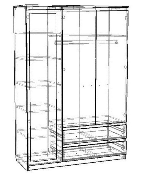 боковые стойки имеют скос под плинтус, большая вместимость, для высоты изделия 2000 мм высота от штанги до дна платяного отделения - 1000 мм, полновыкатные ящики обеспечивают легкий доступ к вещам, размеры зеркала 1520*390 для высоты шкафа 1800 мм, размеры зеркала 1700*390 для высоты шкафа 1900 мм ; 1970*370 для высоты шкафа 2200 мм, размеры зеркала 1700*390 для высоты шкафа 2100 мм