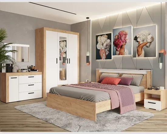— Спальный гарнитур выполнен в цветах: Белый с тиснением «Древесные поры» и «Дуб Крафт Золотой» или «Дуб Крафт Золотой» и «Ателье светлое».