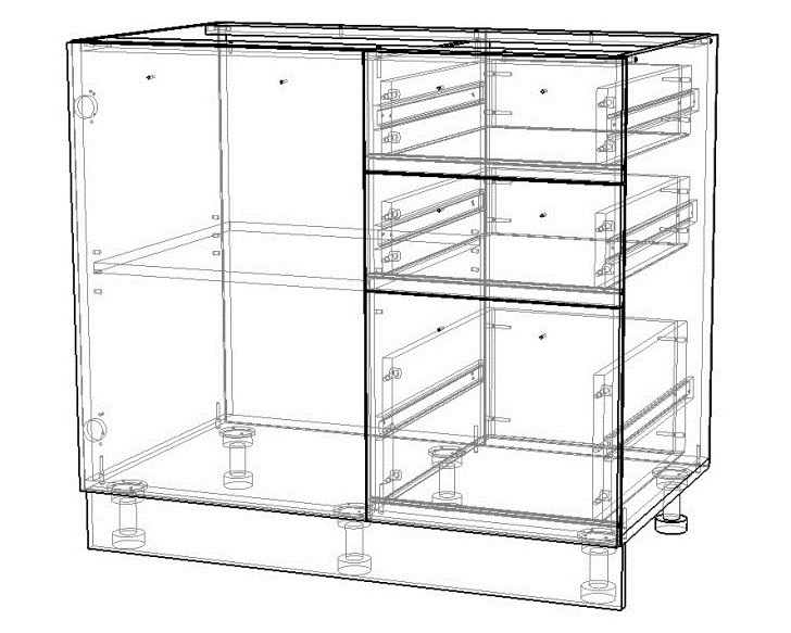 направляющие ящика бесшумного закрывания, направляющие ящика полновыкатного типа, опоры пластиковые черные, торцевые стороны деталей фасадов обработаны кромкой ПВХ толщиной 2 мм!