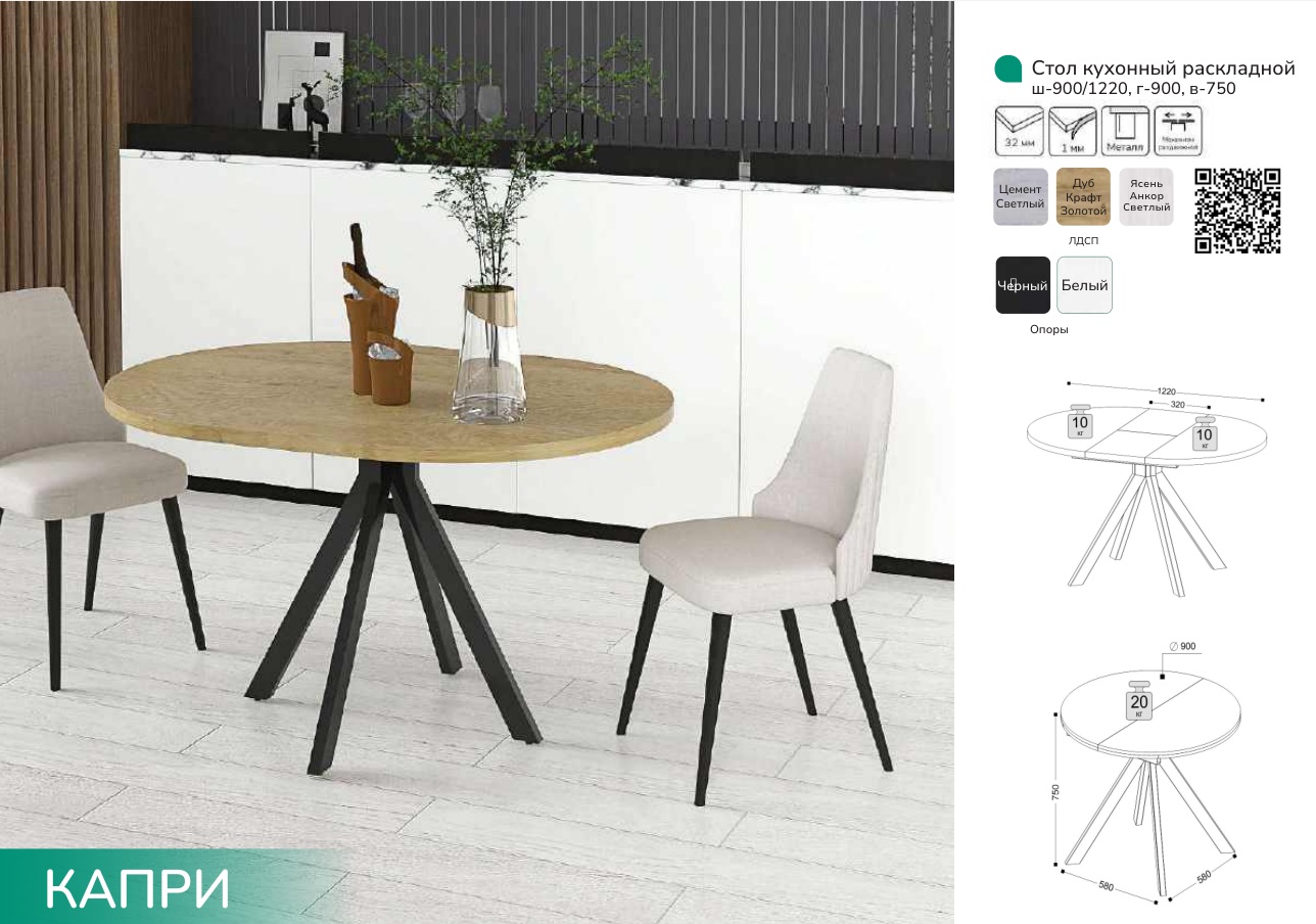 Минималистичный и стильный стол кухонный раскладной “Капри”. Эта устойчивая модель на металлических опорах белого или черного цвета. Практичная и надежная конструкция в новых актуальных цветах. Раздвижной механизм “Бабочка” прост в использовании, позволяет легко увеличивать площадь стола.