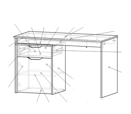 лицевая фурнитура отсутствует, ящики открываются за край фасада, направляющие ящика бесшумного закрывания, направляющие ящика полновыкатного типа, пластиковые подпятники, торцевые стороны столешницы обработаны кромкой ПВХ 2 мм, остальные детали - кромка ПВХ 0,4 мм