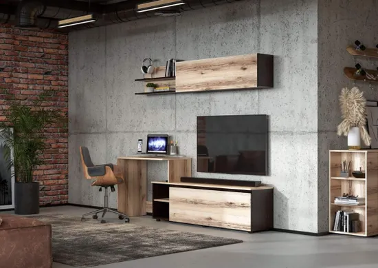 - Нижняя часть многофункциональной тумбы оснащена столом-консолью в декоре «Дуб Делано», который монтируется как с правой, так и с левой стороны. Стандартная высота стола 720 мм, глубина 444 мм и ширина 801 мм позволяют использовать его как компьютерный, стол для обучения и досуга, косметический стол. Глубина стола полностью соответствует глубине распашных шкафов «Берген». Такая эффективная проработка пропорций и объемов позволяет функционально использовать пространство, не нарушая красоты эстетики идеальной геометрии интерьера. Верхняя часть многофункциональной тумбы «Берген» состоит из двух независимых элементов – закрытой тумбы на двух газлифтах с внутренней вертикальной перегородкой глубиной 250 мм и шириной 1201 мм и открытой полкой шириной 801 мм, идеально соответствующей ширине стола. Полка возможна к монтажу на одном уровне с закрытой секцией, создавая монолитный дизайн, монтажу со смещением вверх или вниз, самостоятельной установке в необходимом человеку месте.