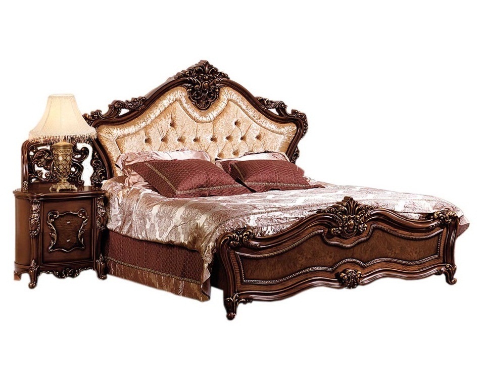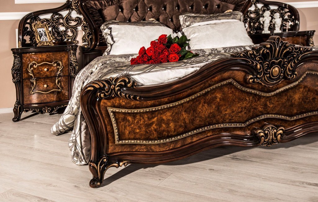 Двуспальная кровать ДЖОКОНДА. Текстура - корень  глянец.  Насыщенные древесные тона мебели, томная округлость линий подчеркивают богатство декора - причудливую филигранность узоров с «позолотой». Материал набора мебели: ламинированная ДСП, МДФ, кромка ПВХ, декор - полиуретан, пенополиуретан, тамбурат, поролон, ткань.Цветовая палитра ткани мягкой обивки варьируется в зависимости от партии ткани.