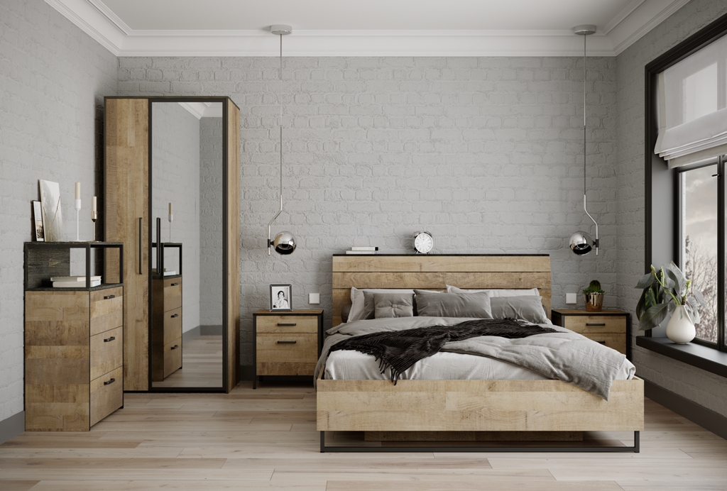 Лицевая фурнитура с тем же покрытием придаёт мебели индустриальную эстетику.