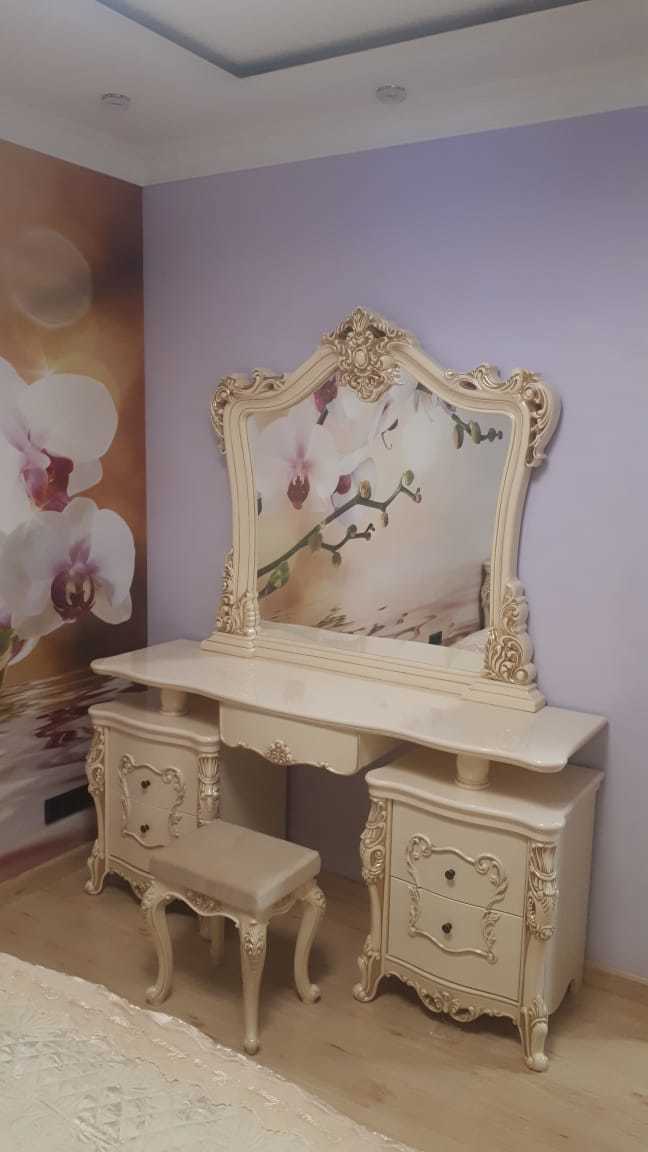 - Прекрасных дам порадуют атрибуты их релаксации - туалетный столик с пуфиком с большим зеркалом и очень вместительный шкаф для нарядов.